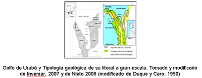 CORPOURABA – UNAL. 1998. Evaluación de zonas de erosión críticas en el litoral caribe antioqueño, Posgrado de Recursos Hidráulicos, Universidad Nacional, Medellín. 199 p.Duque-Caro, H. (1980). Geotectónica y evolución de la región noroccidental colombiana. Boletín Geolológico. Ingeominas, Vol. 23(3), pp. 4-37.