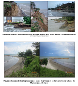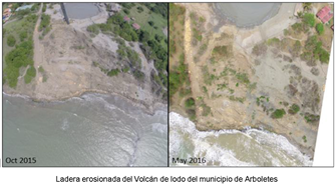Una de las principales preocupaciones a nivel regional en cuestión de la erosión costera, se presenta en el riesgo tan alto que presenta el Volcán de lodo de Arboletes, pues es el volcán de lodo más alto a orilla del mar caribe colombiano, y presenta un alto flujo de turismo, moviendo unos recursos económicos importantes para el municipio. La ladera de este volcán ha presentado aproximadamente una tasa de erosión de 15m en el último año, sin embargo aunque esta tasa no se debe proyectar de forma lineal, no deja de ser un dato alarmante y por tanto requiere de estudios no solo de medición continua, sino también de implementación de medidas de protección y mitigación ante la erosión costera que allí se presenta en tasas tan críticas.