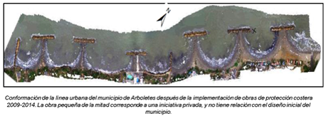 Tanto al suroccidente de las obras de protección costeras como al nororiente de las mismas, se pueden encontrar acantilados de material no consolidado, producto de la erosión que ha venido afectando al municipio y que aún no ha sido estabilizada. Posiblemente haya un incremento en la erosión actual de esos terrenos por efecto sombra de dichas obras de protección que de cierta forma retienen un posible ingreso de sedimentos. Efecto que se ve incrementado debido a la vulnerabilidad del terreno, pues está conformado principalmente por arenas finas y medias sobre un sustrato amplio de arcillolitas y lodolitas producto de la alta actividad de dipirísmo que presenta la región. Sin embargo, cabe aclarar que las playas formadas entre los tómbolos, presentan una aparente estabilidad en su dinámica pudiéndose considerar como playas en equilibrio, no obstante, se requiere continuar con esfuerzos de monitoreo como los que ha empezado a desarrollar la Universidad de Antioquia a través de sus grupos GEOc y la Corporación Autónoma Regional CORPOURABA.